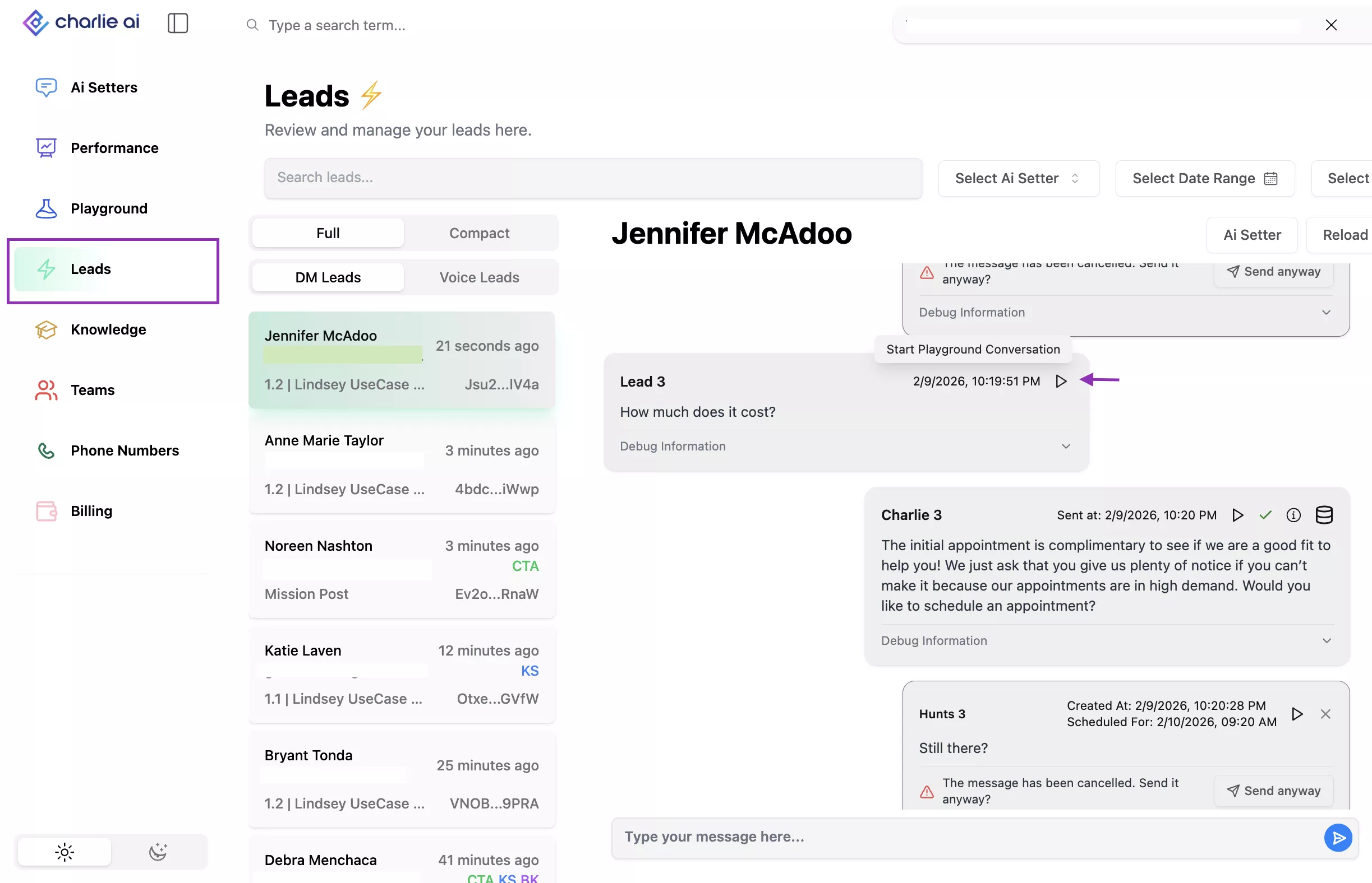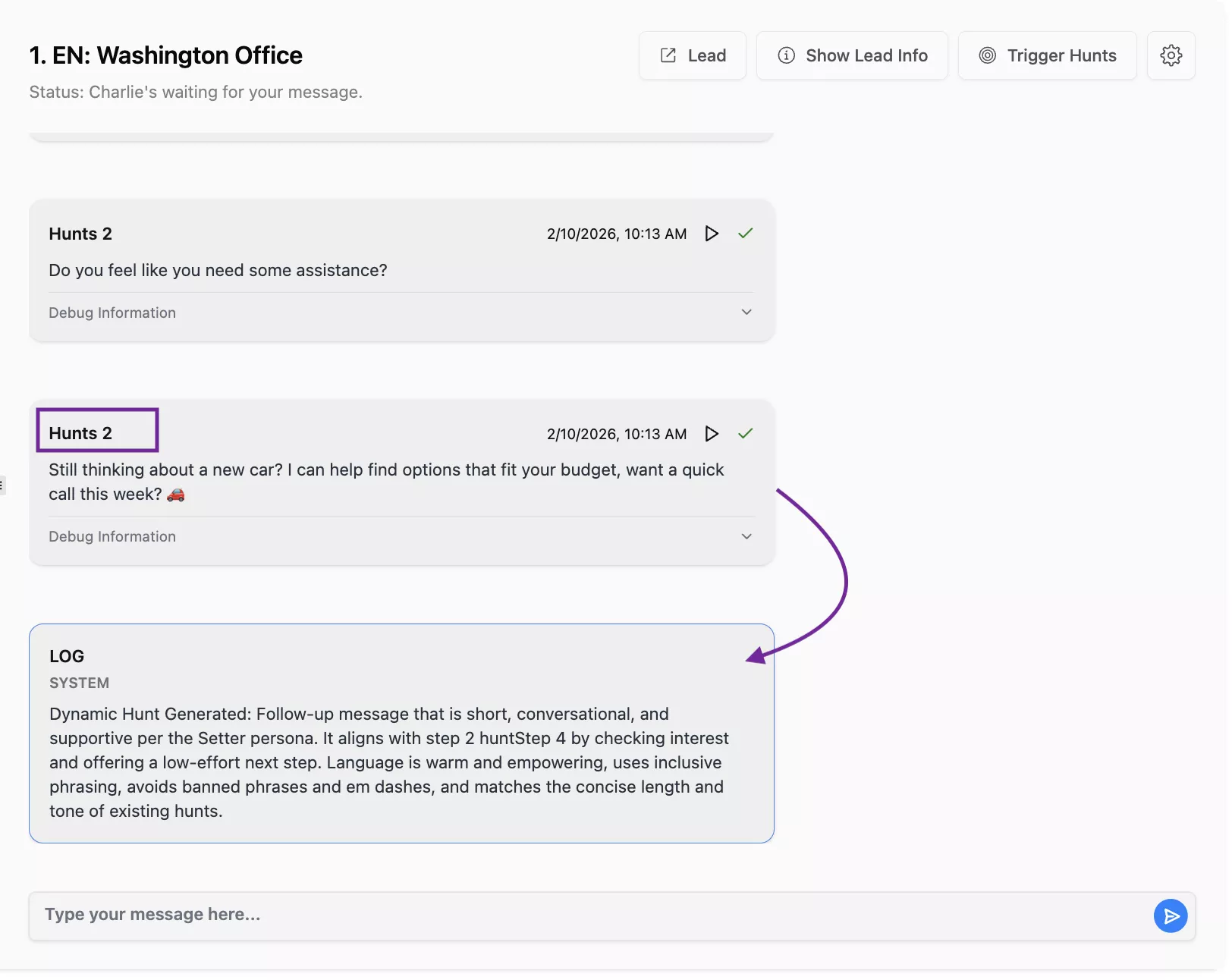 When your predefined Hunt sequences run out, Charlie doesn't go quiet. It automatically generates new, contextual follow ups, conversational & relevant. Everything will be logged, so you know exactly what was sent and why.