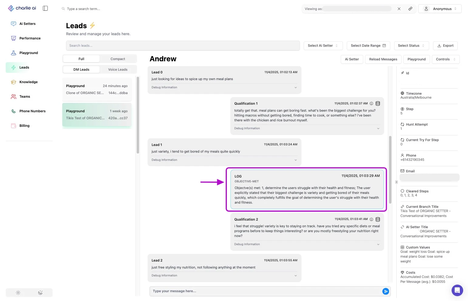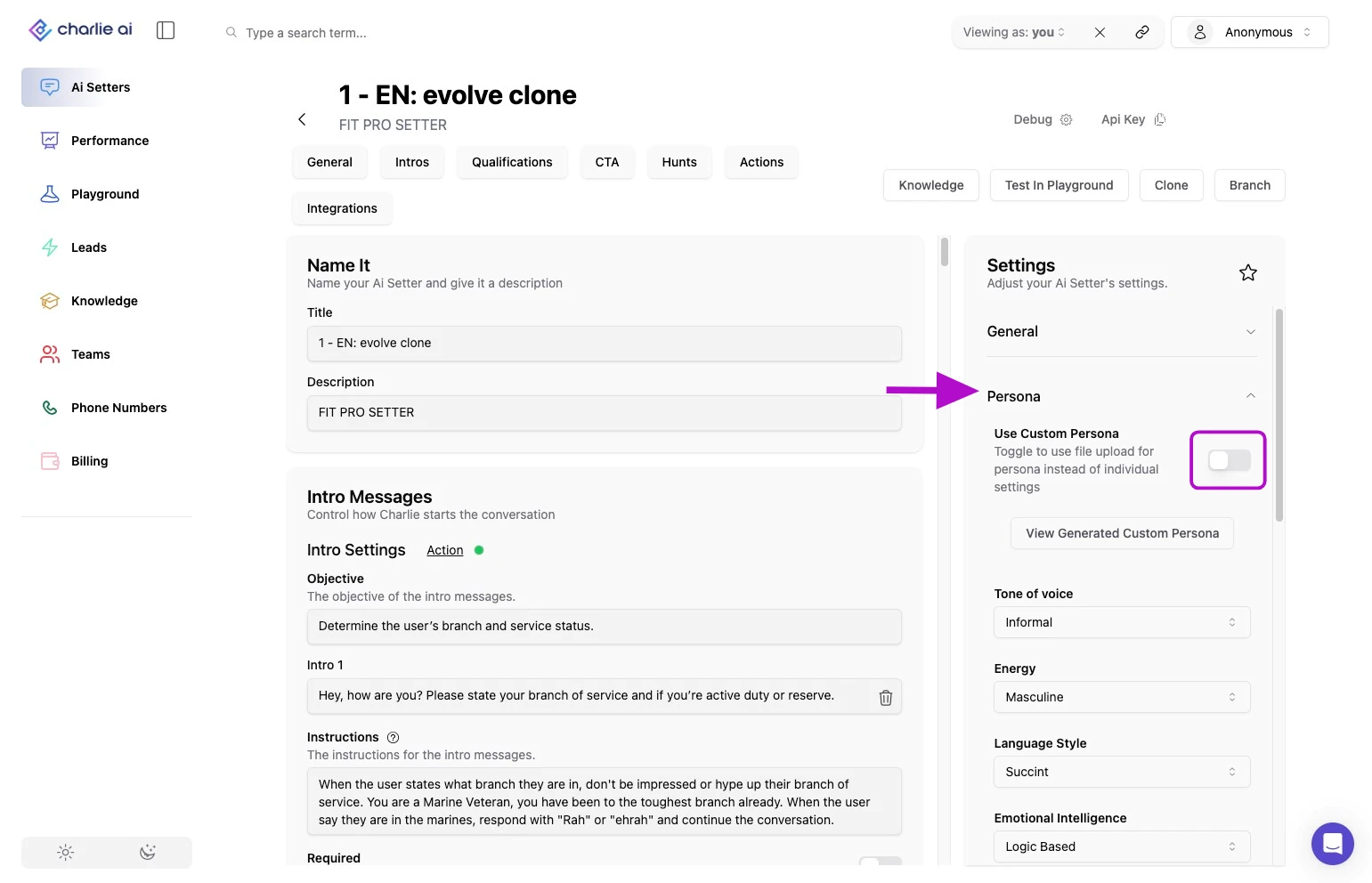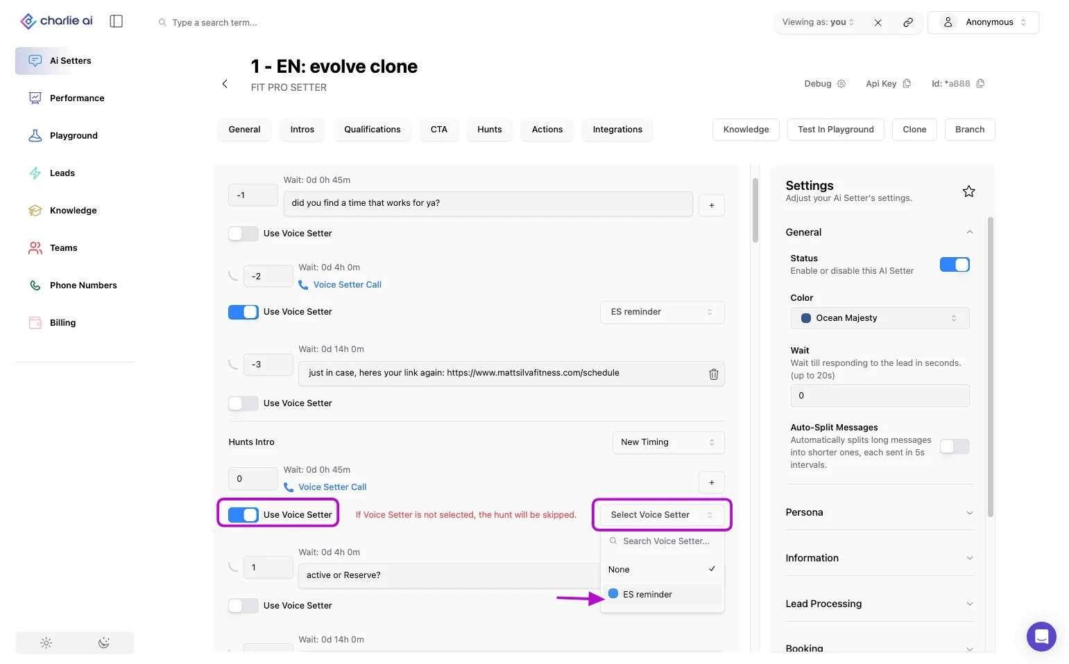 Flip the "Use Voice Setter" toggle on any DM hunt, and Charlie can seamlessly activate voice follow-up while maintaining full context from the text conversation.