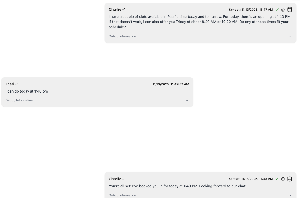 We've enhanced Charlie's conversational intelligence in two ways: it now uses human-friendly time zone names instead of confusing formats, and it employs a more natural, intelligent conversational flow that acknowledges and seamlessly continues the discussion without repeating the lead's exact phrasing.