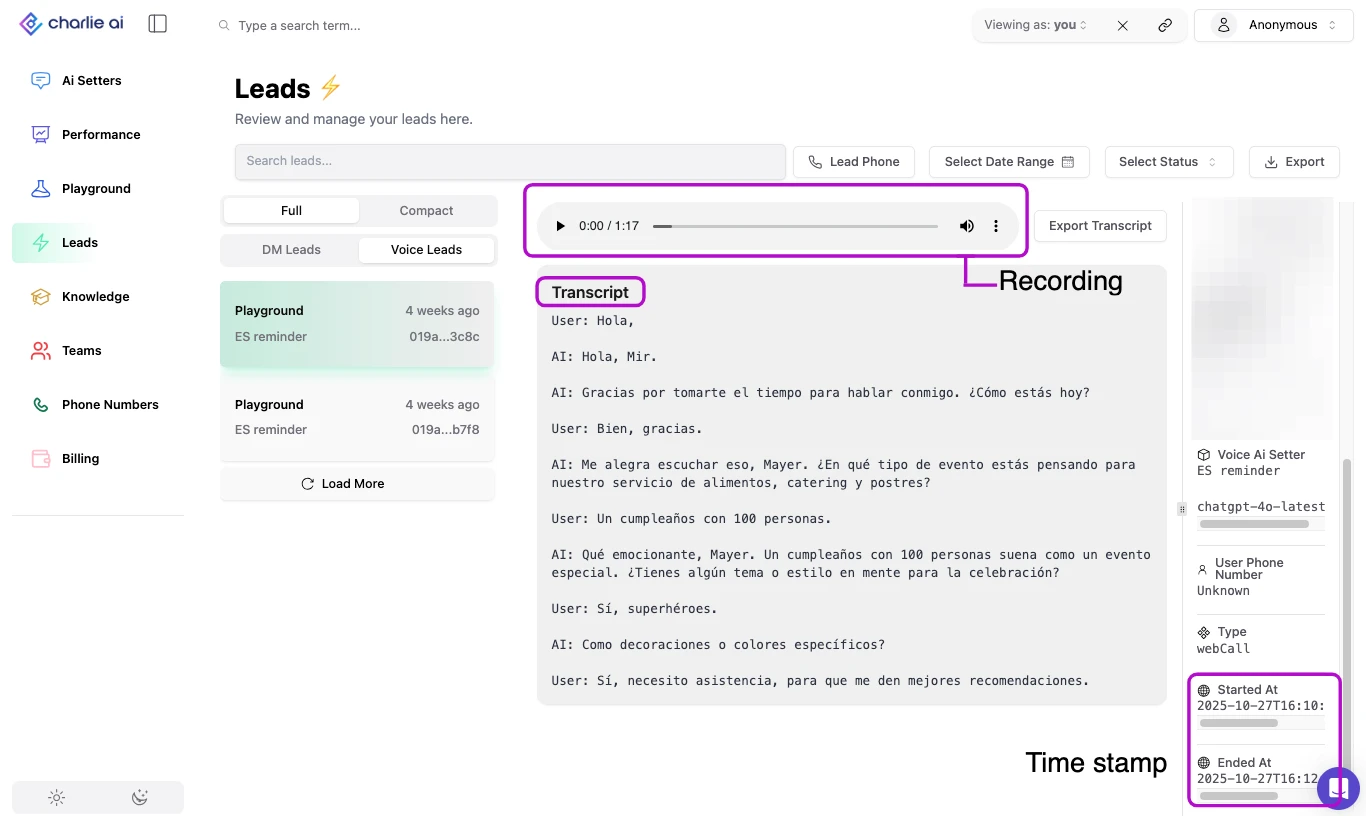 And now, Charlie automatically captures key data: full transcripts, recording URLs, AI summaries, and precise timestamps.